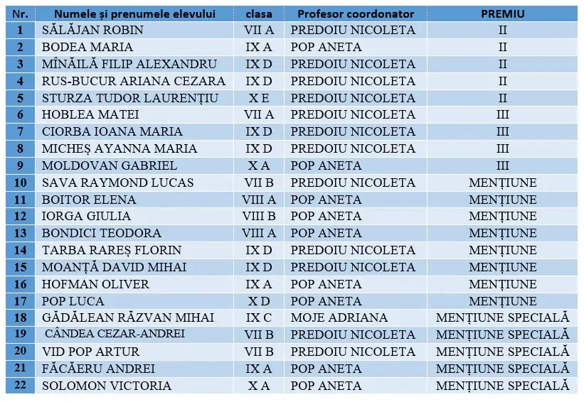 Elevii participanți au obținut rezultate remarcabile, fiind recompensați cu premii și mențiuni.