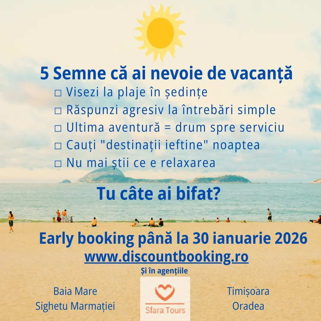 P.S.: Destinațiile astea nu sunt doar vise pe Instagram. Sunt locuri reale, la prețuri reale, mai ales dacă le prinzi în perioada de early booking. Și nu, nu trebuie să aștepți să „ai timp” sau „condiții perfecte”. Timpul perfect nu există. Dar early booking-ul se termină pe 30 ianuarie.