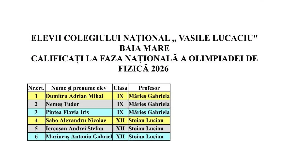 În urma Olimpiadei Județene de Fizică și a clasamentului realizat la nivel național, elevii Colegiului Național „Vasile Lucaciu” Baia Mare și-au adjudecat 6 din cele 9 locuri dobândite de județul Maramureș pentru Olimpiada Națională de Fizică.