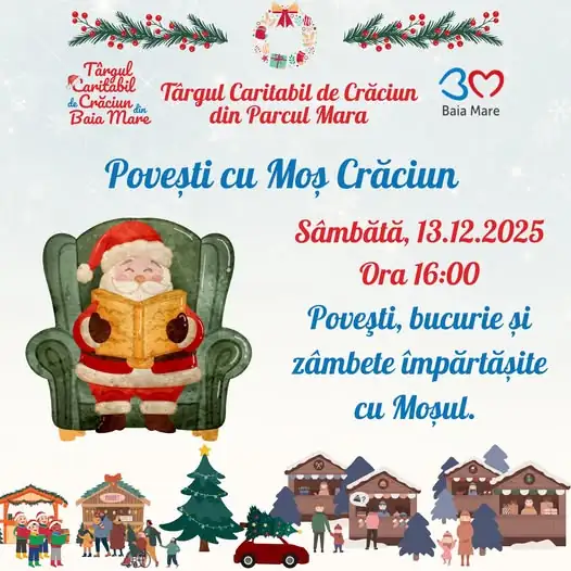 Atmosfera sărbătorilor de iarnă prinde contur în Parcul Mara din Baia Mare, unde sâmbătă, 13 decembrie 2025, începând cu ora 16:00, cei mici sunt așteptați la un eveniment special în cadrul Târgului Caritabil de Crăciun. Organizatorii au pregătit un moment dedicat copiilor, în care Moș Crăciun va fi prezent pentru a citi povești, a asculta dorințele celor mici și a aduce bucurie într-un cadru festiv.
