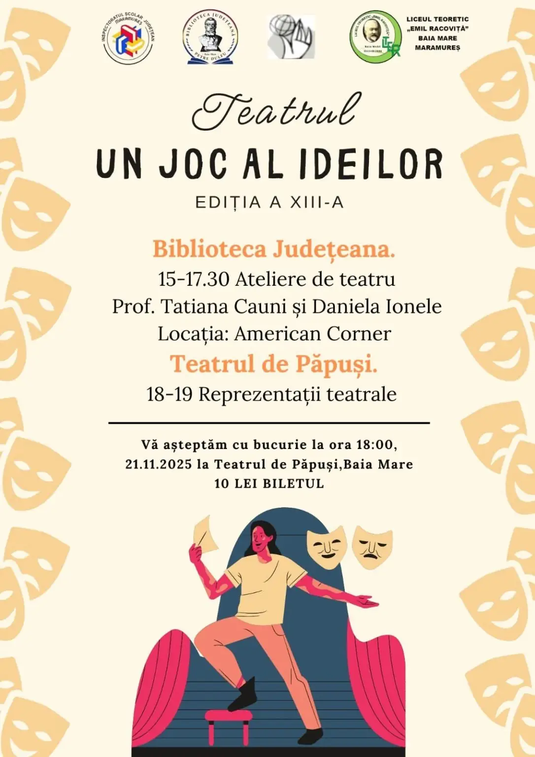 Vineri, 21 noiembrie, orele 15.00 – 17.30, Liceul Teoretic „Emil Racoviță” Baia Mare în colaborare cu Biblioteca Județeană „Petre Dulfu” organizează a XIII-a ediție a Festivalului „Teatrul – un joc al ideilor”.