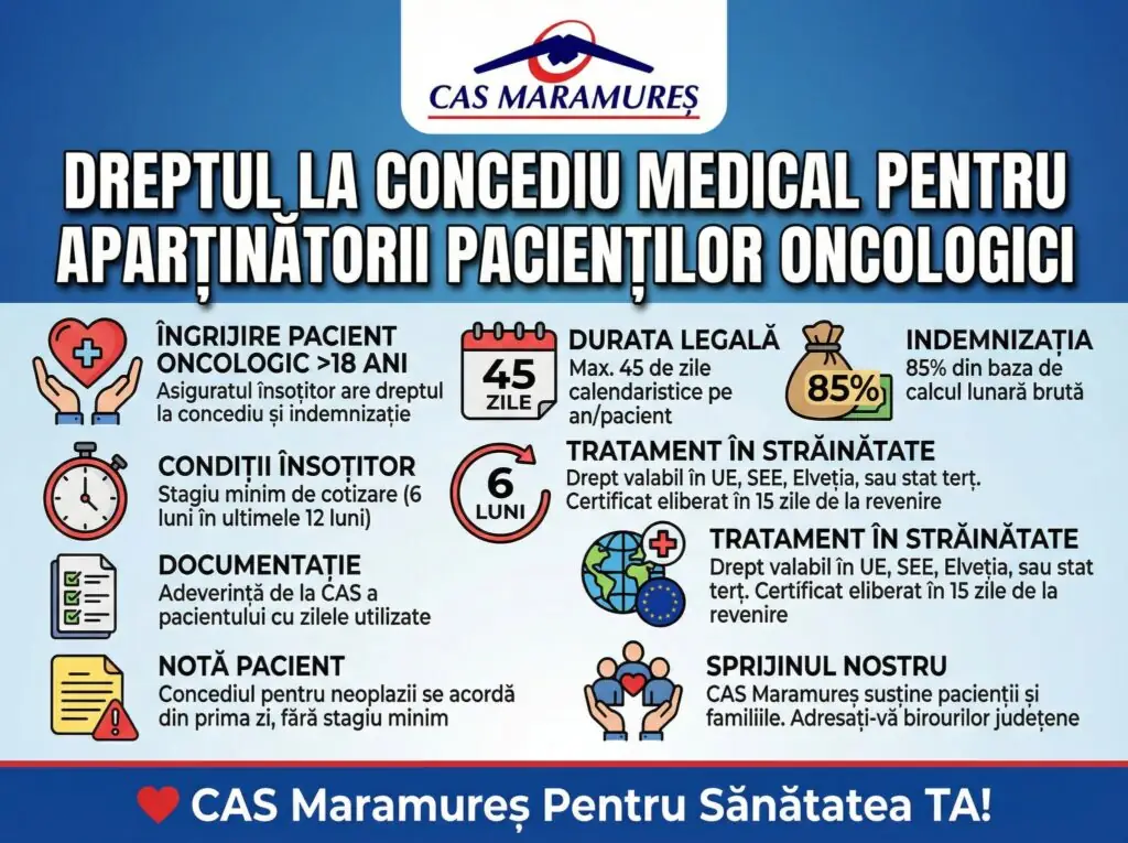 Casa de Asigurări de Sănătate Maramureș anunță că persoanele asigurate care însoțesc un pacient oncologic major, cu vârsta de peste 18 ani, la intervenții și tratamente pot beneficia, în condițiile legii, de concediu medical și indemnizație. Măsura este reglementată de Ordonanța de Urgență nr. 158/2005 privind concediile și indemnizațiile de asigurări sociale de sănătate și de normele de aplicare aferente.