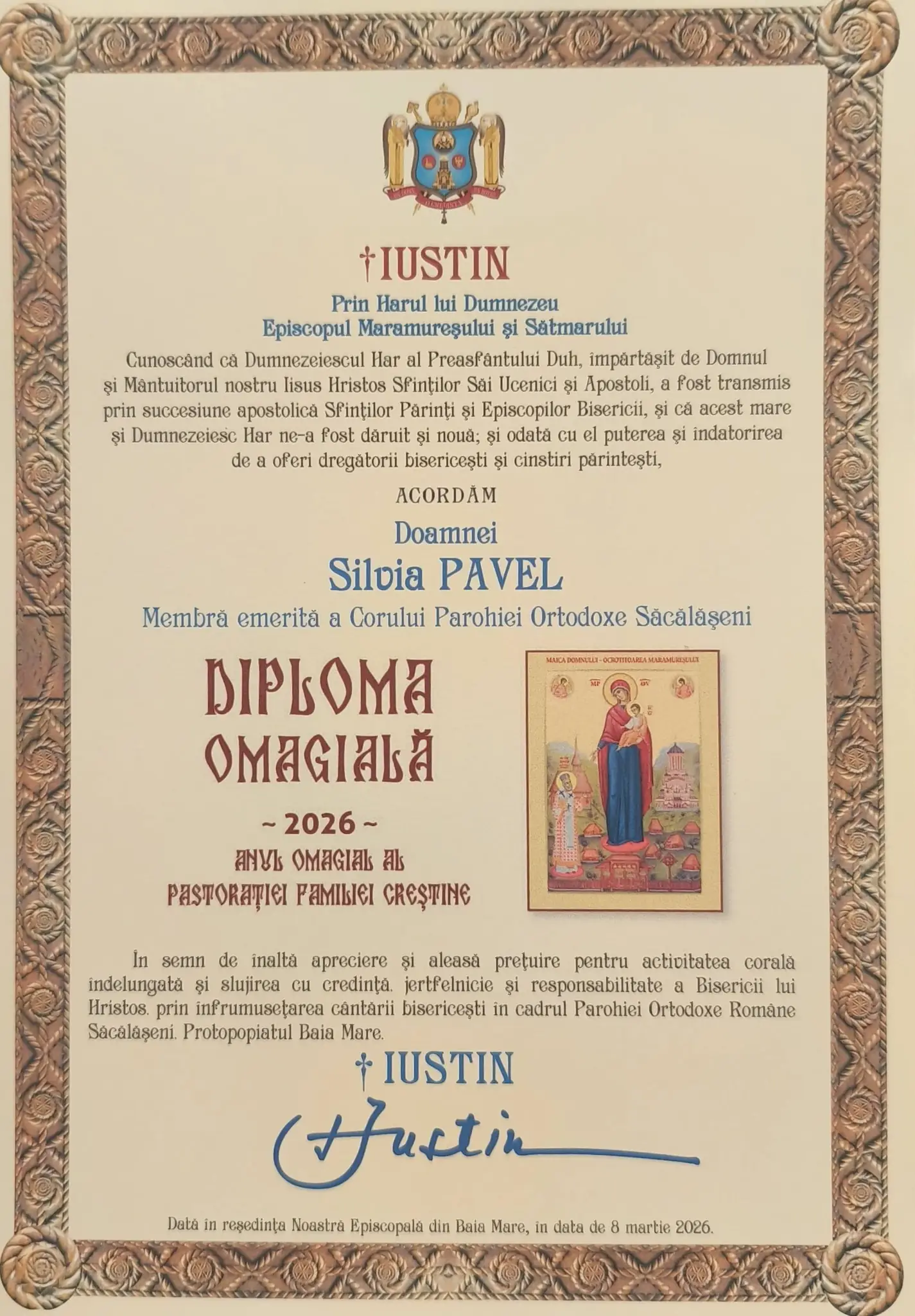 Cu binecuvântarea și cu purtarea de grijă a Preasfințitului Părinte Iustin, Episcopul Maramureșului și Sătmarului, luni, 9 martie 2026, credincioasa Parohiei Ortodoxe „Sfinții Apostoli Petru și Pavel” Săcălășeni, Silvia Pavel, în vârstă de 83 de ani, a fost distinsă cu Diploma Anului Omagial – Anul Omagial al Pastorației Familiei Creștine.