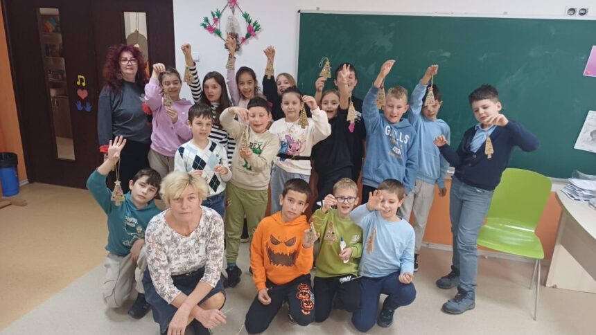 ”Copiii au creat decorațiuni de Crăciun în forma unor brazi, folosind funie și mărgele colorate. Cu multă răbdare, au lipit mărgelele, iar apoi au modelat funia astfel încât să capete forma perfectă a unui brăduț.