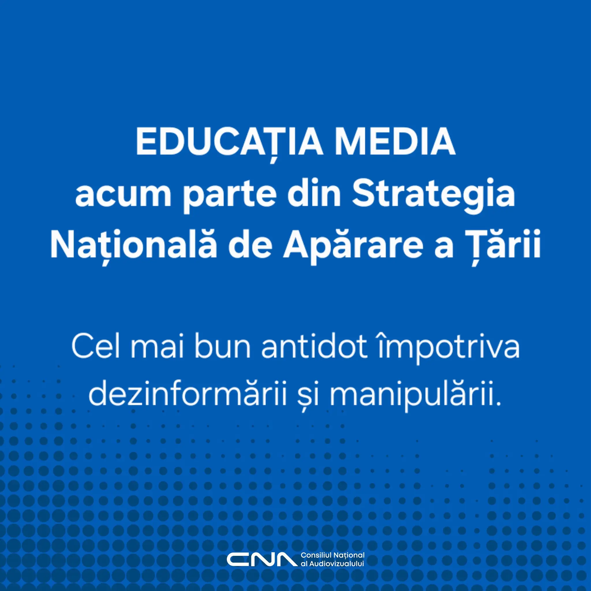Consiliul Național al Audiovizualului (CNA) apreciază decizia Administrației Prezidențiale de a introduce, în mod consistent, educația media, gândirea critică și combaterea dezinformării în noua Strategie Națională de Apărare a Țării pentru perioada 2025–2030. Instituția consideră că demersul reprezintă un pas necesar într-un context marcat de intensificarea fenomenelor de manipulare și influență informațională.