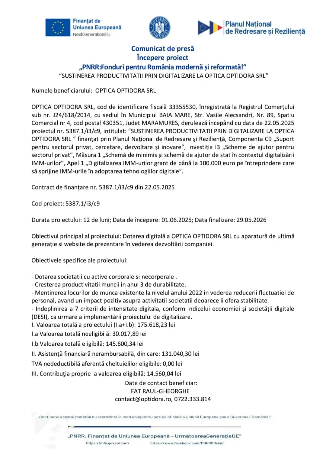 OPTICA OPTIDORA SRL, cod de identificare fiscală 33355530, înregistrată la Registrul Comerțului sub nr. J24/618/2014, cu sediul în Municipiul BAIA MARE, Str. Vasile Alecsandri, Nr. 89, Spatiu Comercial nr 4, cod postal 430351, Judet MARAMURES, derulează începând cu data de 22.05.2025 proiectul nr. 5387.1/i3/c9, intitulat: “SUSTINEREA PRODUCTIVITATII PRIN DIGITALIZARE LA OPTICA OPTIDORA SRL “ finanţat prin Planul Naţional de Redresare şi Rezilienţă, Componenta C9 „Suport pentru sectorul privat, cercetare, dezvoltare și inovare”, Investiția I3 „Scheme de ajutor pentru sectorul privat”, Măsura 1 „Schemă de minimis și schemă de ajutor de stat în contextul digitalizării IMM-urilor”, Apel 1 „Digitalizarea IMM-urilor grant de până la 100.000 euro pe întreprindere care să sprijine IMM-urile în adoptarea tehnologiilor digitale”.