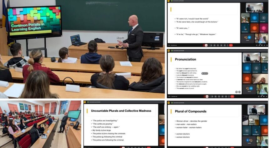 A fost o conferință densă în idei, care a reușit să captiveze atenția elevilor pasionați de limba engleză. Domnul prodecan, conf. univ. dr. Ioan Beniamin Pop, i-a purtat pe participanți prin tainele lingvisticii limbii engleze și ale construcțiilor lexicale și gramaticale, oferind explicații clare și utile pentru înțelegerea unor posibile dificultăți în studiul limbii engleze.