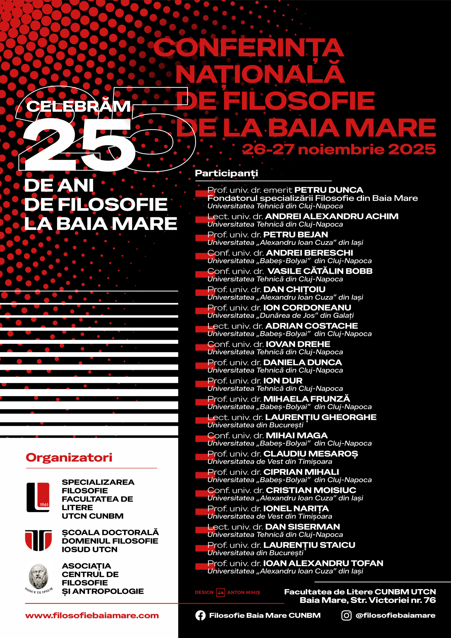 Baia Mare găzduiește în 2025 una dintre cele mai importante manifestări academice din istoria sa recentă. Specializarea Filosofie din cadrul Universității Tehnice din Cluj-Napoca – Centrul Universitar Nord Baia Mare (UTCN-CUNBM) împlinește 25 de ani de existență neîntreruptă, iar momentul va fi marcat printr-o Conferință Națională de Filosofie, programată în perioada 26–27 noiembrie 2025.