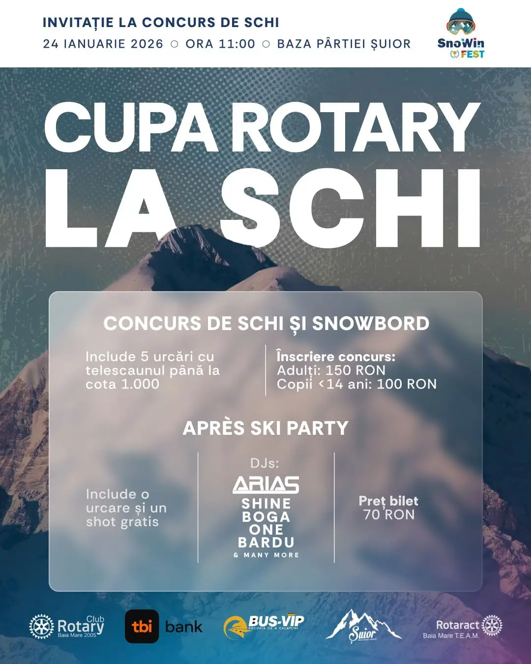 Rotary Club Baia Mare 2005, alături de Rotaract TEAM Baia Mare, invită iubitorii sporturilor de iarnă și ai bunei dispoziții la Cupa Rotary la Schi – SnoWin Fest, un eveniment dedicat mișcării, distracției și spiritului de comunitate.
