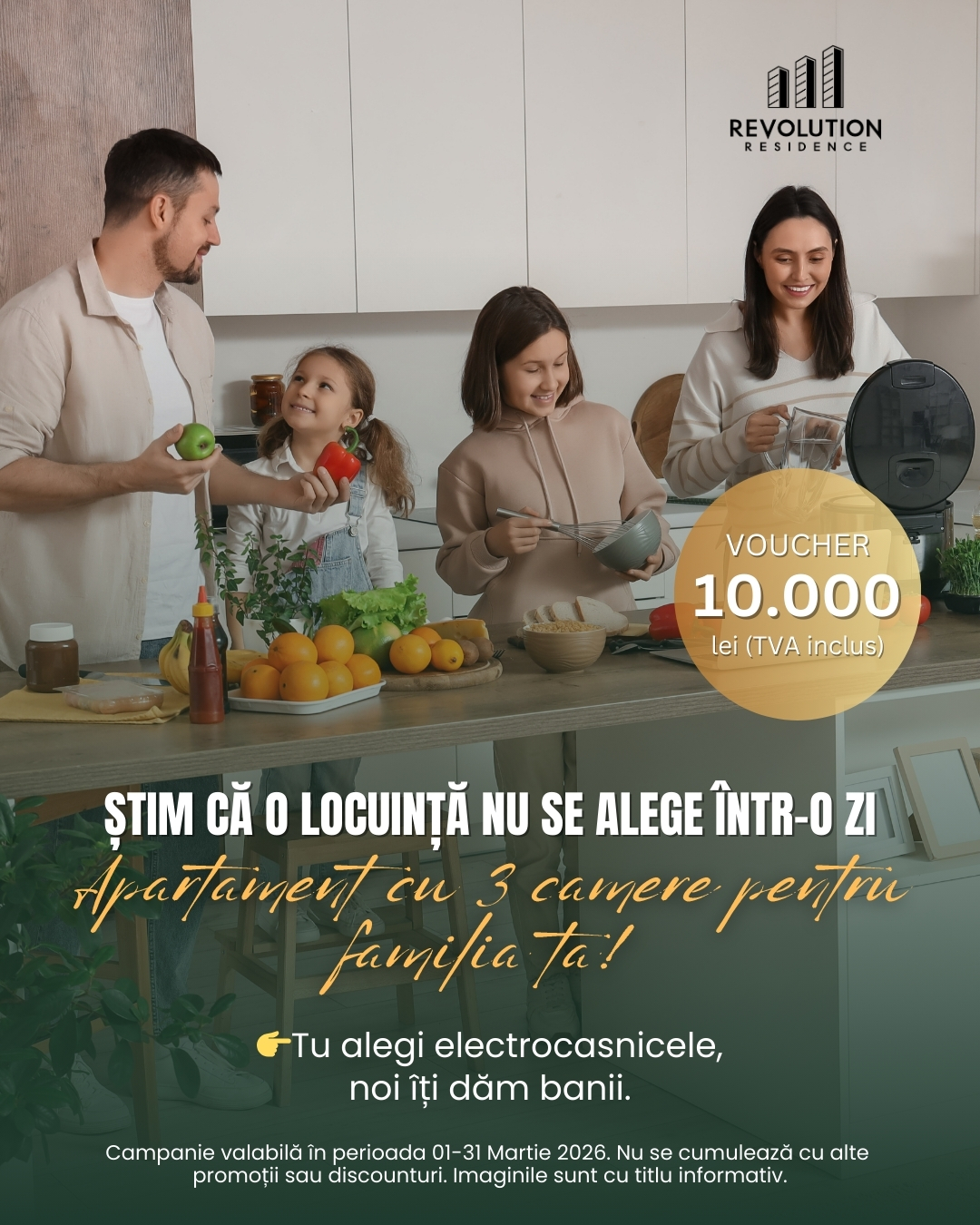 În perioada 1 – 31 martie 2026, cei care aleg un apartament de 3 camere – tipologia preferată de familii sau de cei care fac pasul către o locuință stabilă pe termen lung – primesc un voucher cadou de 10.000 de lei (tva inclus), pentru achiziția electrocasnicelor.