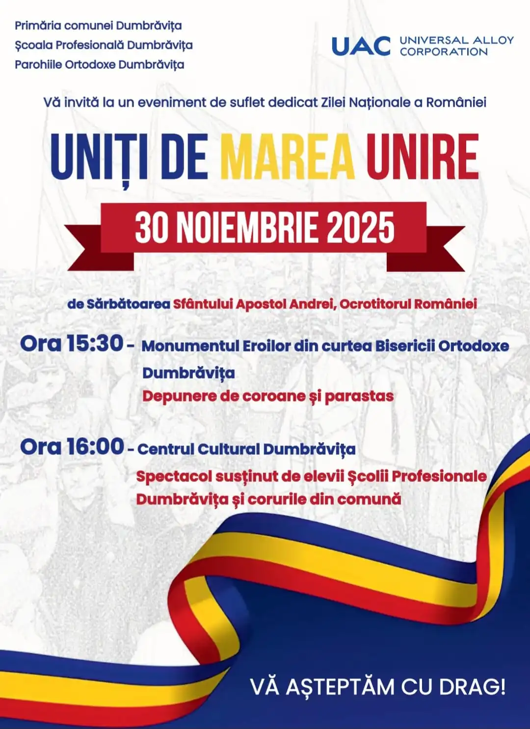 Comuna Dumbrăvița se pregătește pentru un eveniment special dedicat Zilei Naționale a României, organizat cu sprijinul Primăriei Dumbrăvița, Școlii Profesionale și Parohiilor Ortodoxe din localitate, în parteneriat cu Universal Alloy Corporation.