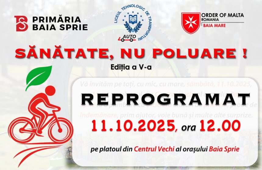 Organizatorii evenimentului „SĂNĂTATE, NU POLUARE!” anunță reprogramarea activităților pentru data de sâmbătă, 11 octombrie 2025, ora 12.00, după ce a fost anunșată prognoza meteo nefavorabilă pentru acest weekend, cu ploi și vânt puternic, care nu permite desfășurarea în condiții de siguranță și voie bună a plimbării cu bicicleta.