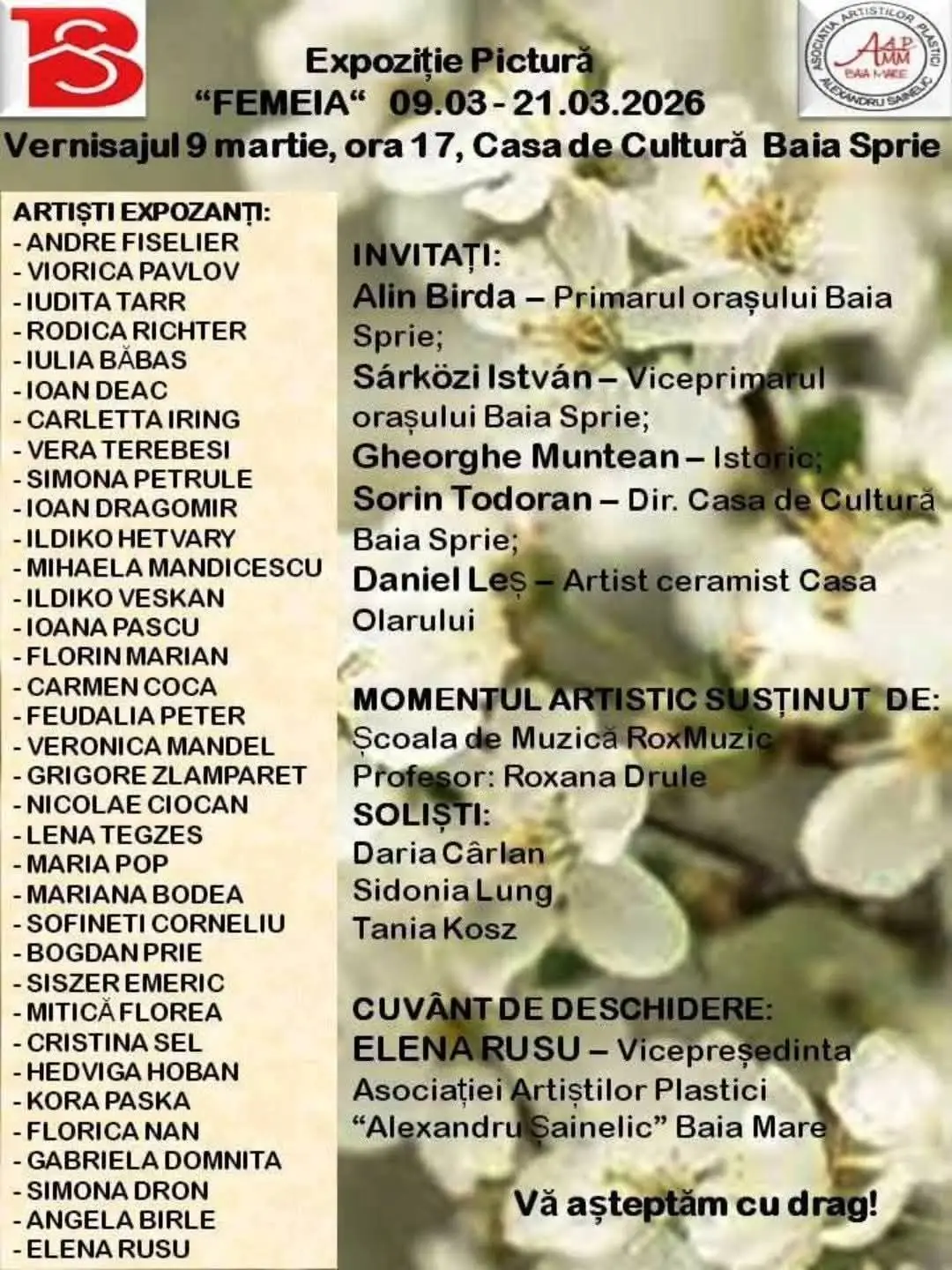 Casa de Cultură Baia Sprie, în parteneriat cu Asociația Artiștilor Plastici Maramureș „Alexandru Șainelic” Baia Mare, organizează luni, 9 martie, de la ora 17:00, vernisajul expoziției de pictură „FEMEIA”.