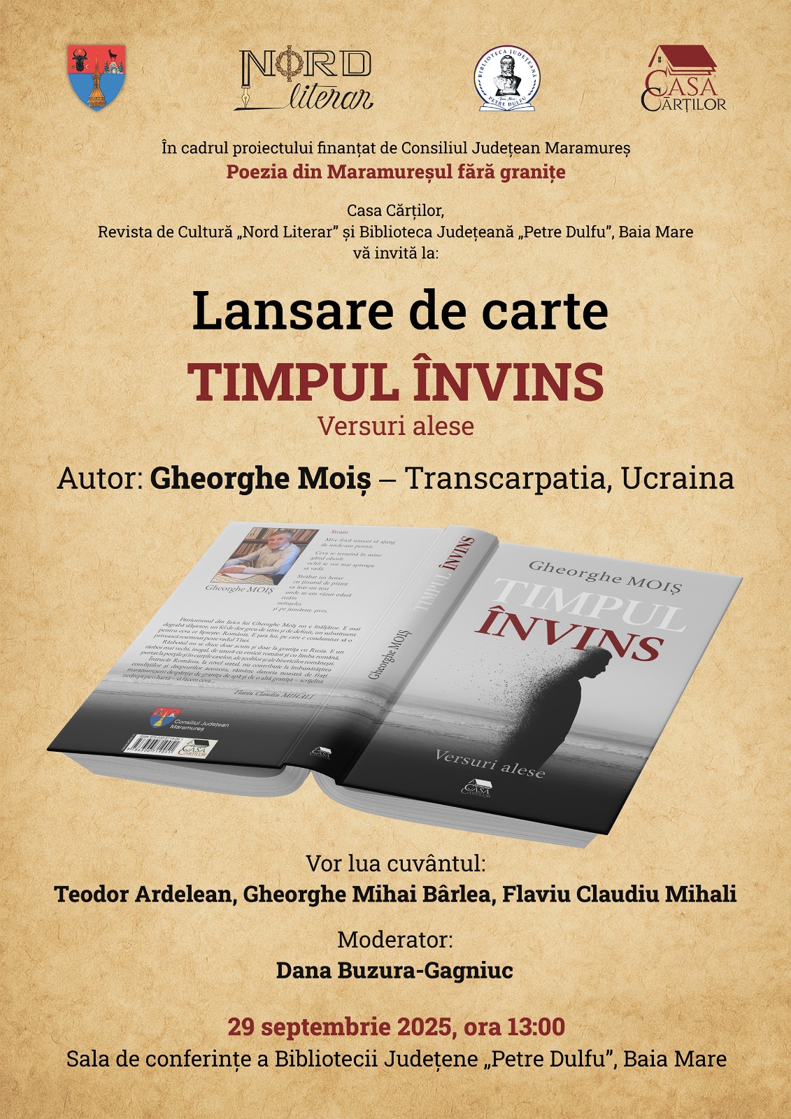 Biblioteca Județeană „Petre Dulfu” Baia Mare în colaborare cu Editura Casa Cărților și Revista de cultură „Nord Literar” organizează luni, 29 septembrie, ora 13:00, lansarea antologiei de poezie „Timpul învins. Versuri alese”, autor Gheorghe Moiș, dascăl român din Biserica Albă – Transcarpatia, Ucraina, carte apărută la Editura Casa Cărților, Baia Mare, 2025.