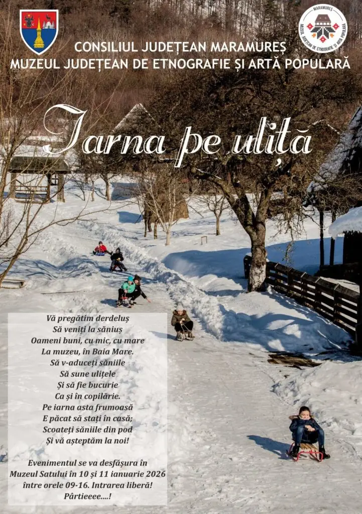 Evenimentul „Iarna pe uliță” se desfășoară la Muzeul Satului din Baia Mare, în zilele de 10 și 11 ianuarie 2026, între orele 09:00–16:00.