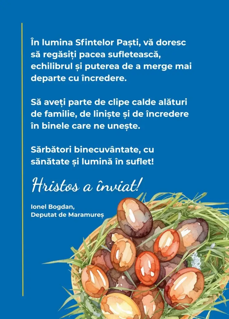 Ionel Bogdan, deputat Maramureș: „În lumina Sfintelor Paști, vă doresc să regăsiți pacea sufletească, echilibrul și puterea de a merge mai departe cu încredere”
