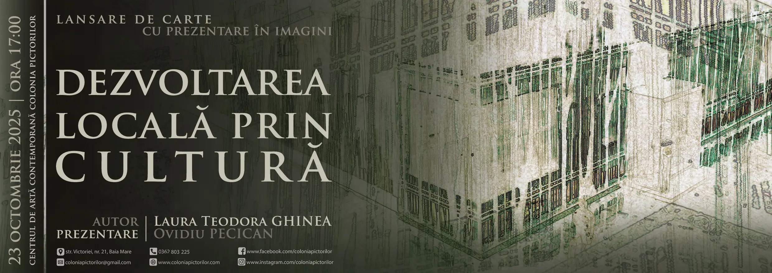 Joi, 23 octombrie, ora 17:00, la Galeria Hollosy, Centrul de Artă Contemporană Colonia Pictorilor vă invită la lansarea cărții „Dezvoltarea locală prin cultură”, semnată de conf. univ. dr. habil. Laura Teodora Ghinea.