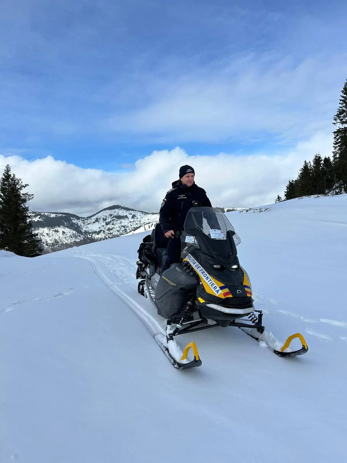 „Doi oameni ai muntelui, obișnuiți cu condițiile dure, care patrulează cu snowmobilele în zona Muntelui Copilaș, la o altitudine de aproximativ 1.600 de metri, acolo unde viscolul, frigul și izolarea fac parte din misiunea zilnică.
