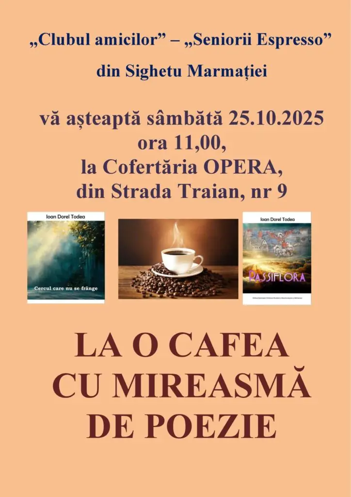 Sâmbătă, 25 octombrie 2025, de la ora 11:00, la Cofetăria OPERA din Sighetu Marmației de pe Strada Traian nr. 9, va avea loc o întâlnire organizată de „Clubul amiculilor” – „Seniorii Espresso”.
