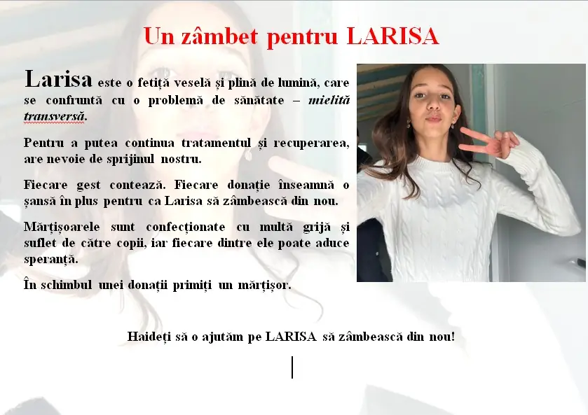 Banii vor fi folosiți pentru a o ajuta pe Larisa, o fetiță veselă și plină de lumină, care se confruntă cu o problemă de sănătate – mielită transversă. Pentru a putea continua tratamentul și recuperarea, are nevoie de sprijinul nostru. Fiecare gest contează. Fiecare donație înseamnă o șansă în plus pentru ca Larisa să zâmbească din nou. Haideți să o ajutăm pe LARISA să zâmbească din nou!
