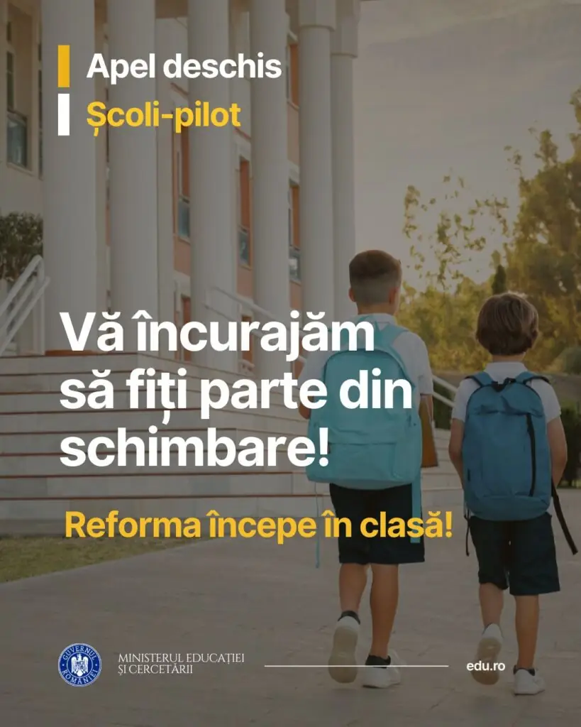 Ministerul Educației a lansat apelul oficial pentru înscrierea unităților de învățământ în rețeaua națională de școli-pilot pentru anul școlar 2026–2027, invitând directorii și cadrele didactice să propună modele inovatoare de organizare, predare și management educațional. Inițiativa urmărește testarea unor soluții moderne în sistemul de învățământ preuniversitar, care ulterior ar putea fi extinse la nivel național.