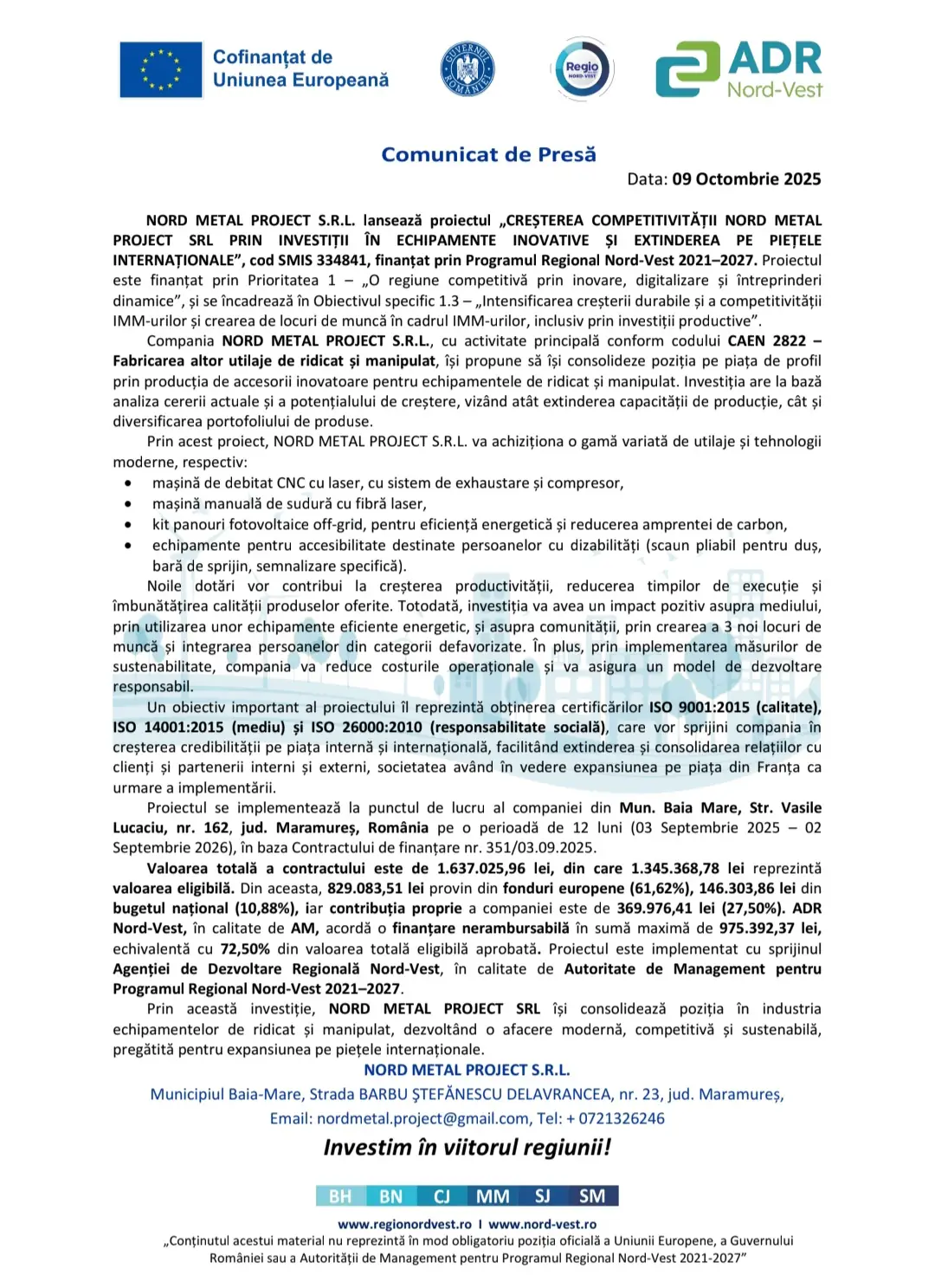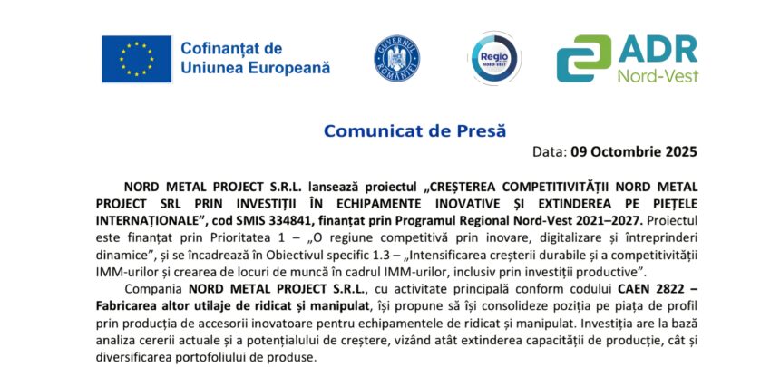 NORD METAL PROJECT S.R.L. lansează proiectul ,,CRESTEREA COMPETITIVITĂTII NORD METAL PROJECT SRL PRIN INVESTITII ÎN ECHIPAMENTE INOVATIVE ȘI EXTINDEREA PE PieTele INTERNAŢIONALE”, cod SMIS 334841, finanțat prin Programul Regional Nord-Vest 2021-2027