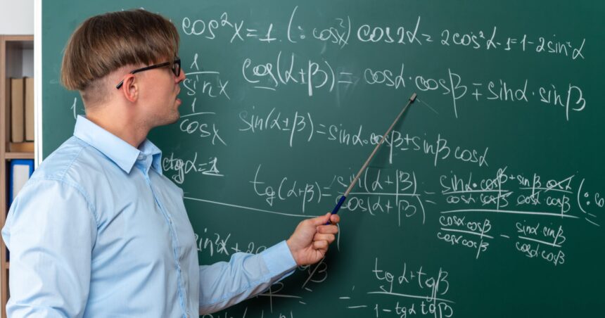 young male teacher wearing glasses with pointer explaining lesson happy and positive smiling standing near blackboard with mathematical formulas in classroom