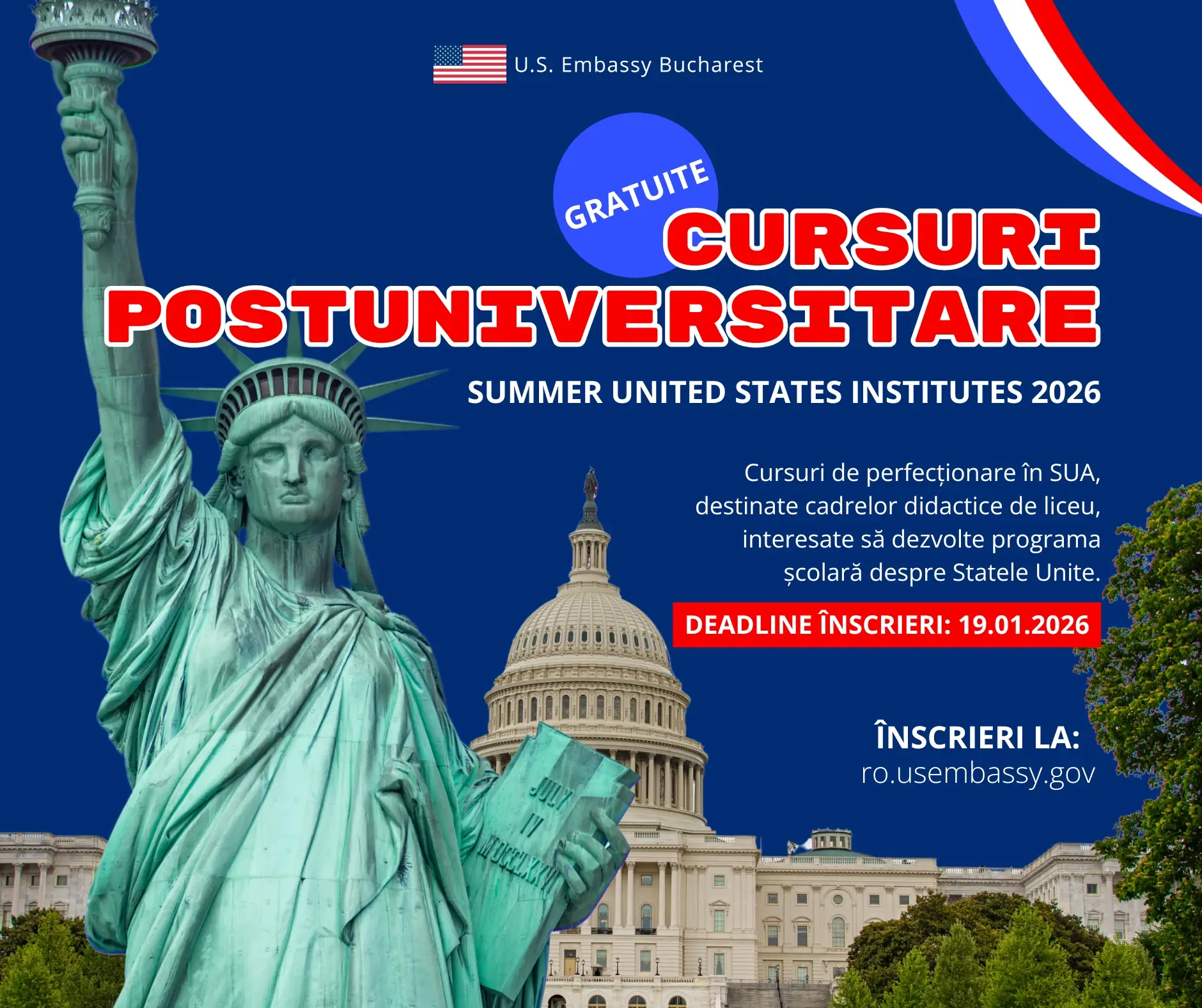 Ambasada Statelor Unite în România invită profesorii de liceu aflați la mijlocul carierei să se înscrie la programul Study of the U.S. Institutes (SUSI) pentru profesori de gimnaziu și liceu, un program academic intensiv de cinci săptămâni în Statele Unite, care va avea loc în vara anului 2026. Participanții vor explora conținut academic riguros legat de programul America250, vor participa la prelegeri, ateliere și activități culturale și vor lua parte la o experiență academică de teren de o săptămână într-o altă regiune a Statelor Unite. Programul sprijină profesorii care intenționează să dezvolte sau să îmbunătățească conținutul și materialele de studii americane în instituțiile lor.