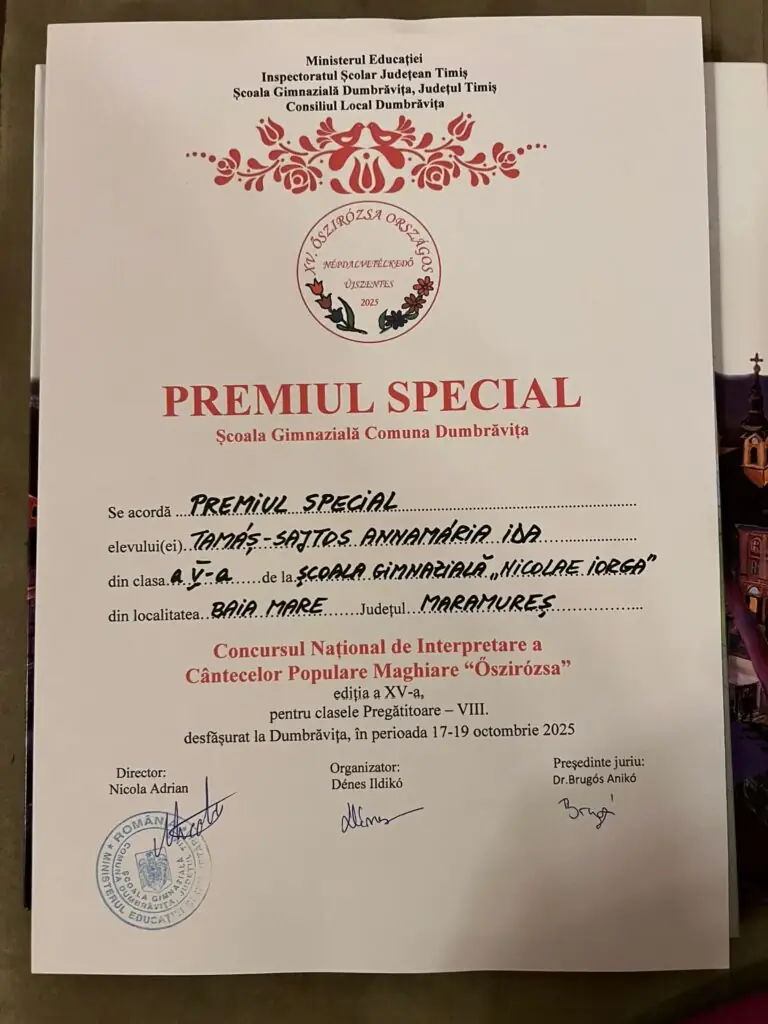 La Concursul Național de Interpretare a Cântecelor Populare Maghiare „Őszirózsa”, desfășurat între 17 și 19 octombrie 2025 la Dumbrăvița, județul Timiș, Tamás-Sajtos Annamária-Ida, elevă în clasa a V-a la Școala Gimnazială „Nicolae Iorga” Baia Mare, a reprezentat cu mândrie județul Maramureș.