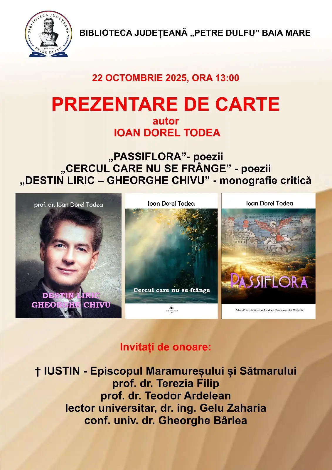 În paralel cu această recunoaștere meritată, prof. dr. Ioan Dorel Todea își continuă activitatea publicistică și de promovare a literaturii prin intermediul lansărilor de carte. Astfel, pe 22 octombrie 2025, la ora 13:00, Biblioteca Județeană „Petre Dulfu” Baia Mare va găzdui o amplă prezentare de carte a autorului, prilej cu care vor fi aduse în fața publicului trei volume recente: