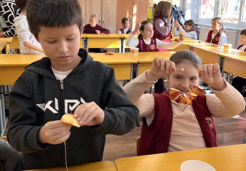 Apoi, școlarii, îndrumați îndeaproape de colega noastră Gabriela Filip, au învățat să înșire poame pe ață, având astfel posibilitatea de a deprinde vechi practici de păstrare a fructelor și a legumelor pe timpul iernii.