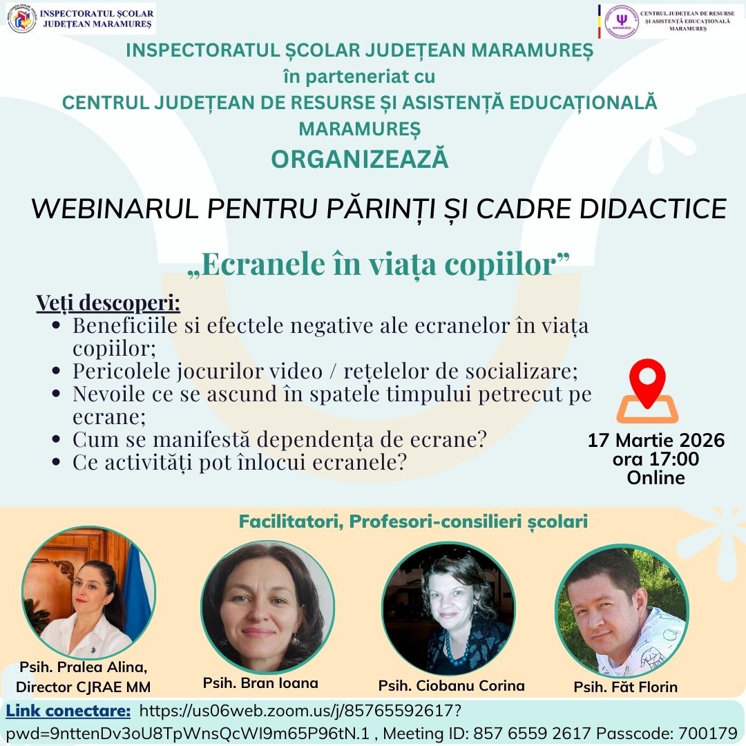 În data de 17 martie, ora 17:00, Inspectoratul Școlar Județean Maramureș, în parteneriat cu Centrul Județean de Resurse și Asistență Educațională Maramureș, organizează webinarul „Ecranele în viața copiilor”