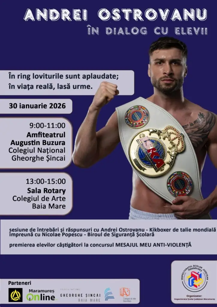 Evenimentul intitulat „Mesajul meu antiviolență”, ajuns la cea de-a IV-a ediție, s-a desfășurat sub forma unui dialog interactiv între sportivul Andrei Ostrovanu, kickboxer de talie mondială, și comisarul șef de poliție Nicolae Popescu, reprezentant al Biroului de Siguranță Școlară. Discuțiile le-au oferit elevilor o perspectivă clară asupra diferenței dintre violența controlată și disciplinată specifică sportului de performanță și violența manifestată în mediul școlar, cu efecte negative pe termen lung.